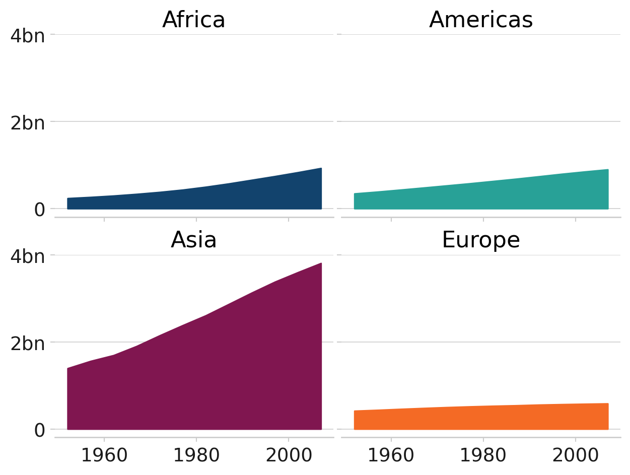 This chart uses the afcharts theme. It contains four subplots in a two by two grid showing how the populations of four continents have changed over time. Each subplot is labelled with the continent. The subplots have a common y axis, with no values on the x axis to facilitate for a simple comparison of the relative values. Each subplot is filled with a different colour from the Analysis Function categorical colour palette to be distinct from other subplots.
