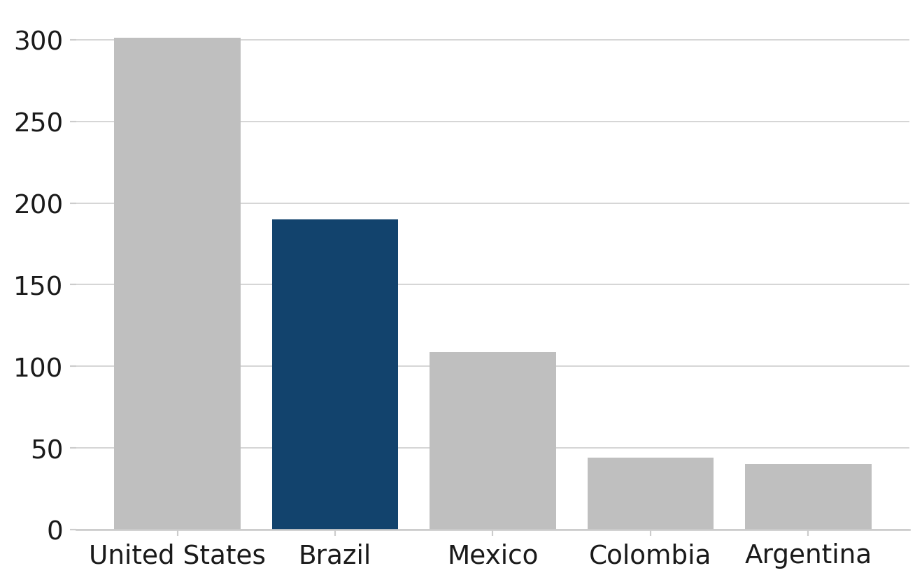 This bar chart uses the afcharts theme, and shows the populations of five countries of the Americas in descending order. The country names are given on the x axis, with all chart text in black in a sans serif font. Four of the bars on the chart are light grey, and the bar for Brazil is filled in dark blue to highlight it.