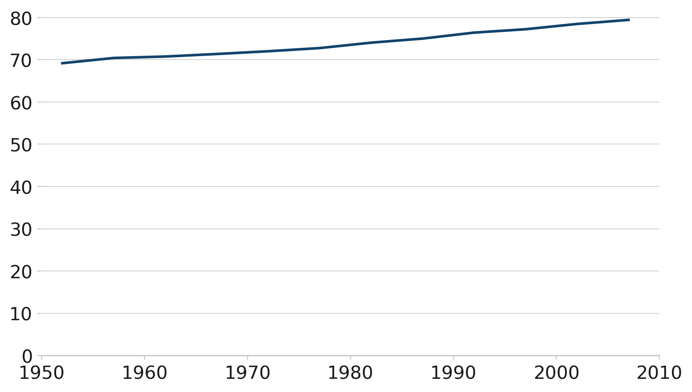 plt.ylim(0, max(df["lifeExp"]) + 5)