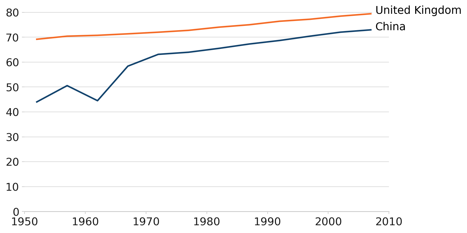 This line chart uses the afcharts theme and there are thin pale grey lines extending from the y axis. There are two thicker lines showing the life expectancy in the UK and China over time. The line colours are from the main Analysis Function palette - dark blue for China and orange for the UK, denoted by a legend at the bottom of the chart.