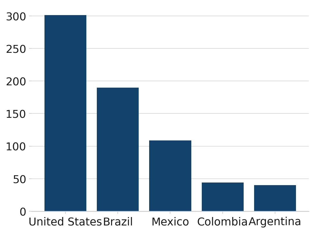 This bar chart uses the afcharts theme, and shows the populations of the five most populous countries in the Americas. Each bar is dark blue and labelled by country underneath. All text is black in a sans serif font. Pale grey grid lines extend out from the y axis.