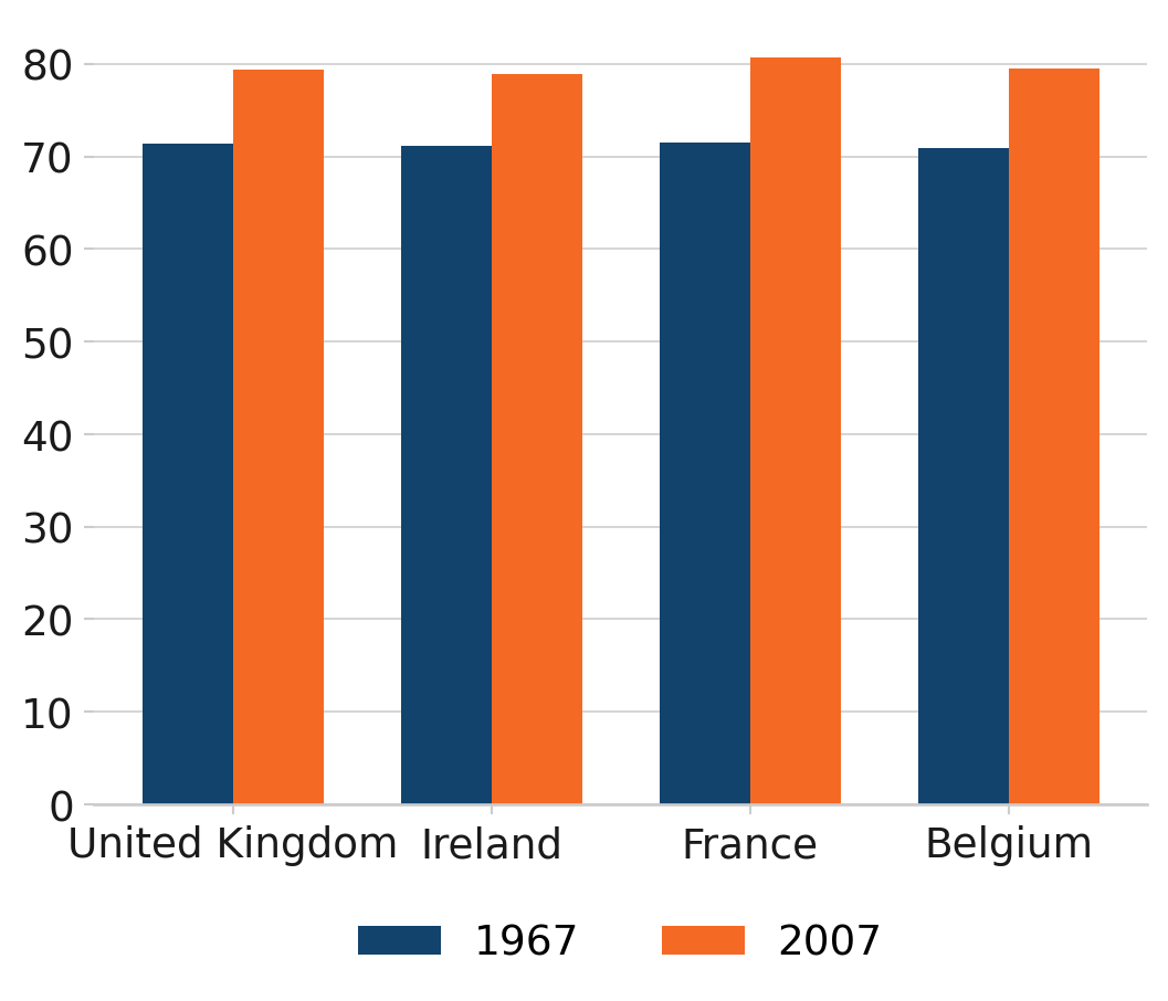 df = gapminder().query("year in [1967, 2007] and country in ['United Kingdom', 'Ireland', 'France', 'Belgium']")