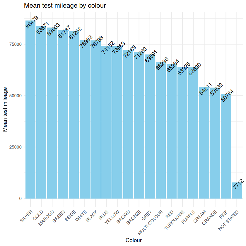 As well as calculating descriptive statistics it is important to visualize your data. Plots helps you see the spread of the data, to assess skew and to spot whether anomalies or nulls are present. In this example, we have applied mean() to show the mean test_mileage of cars grouped by colour. The argument na.rm has been added to the summarise() function which lets you decide whether you want NA values removing or leaving in the calculations. A bar chart has been used for visualisation.