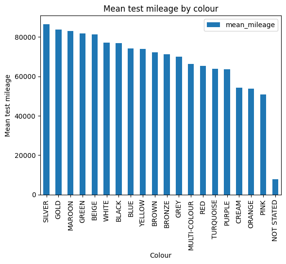 (mean_mileage.plot(title='mean test mileage by colour', kind='bar', x='colour', y='mean_mileage')